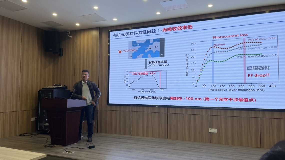 在报告中,唐正研究员系统阐释了电荷转移态在有机光伏器件中的动力学行为,深入分析了其对器件开路电压损失的影响机制,并分享了其团队在降低电压损失、提升器件效率方面的最新研究进展。刘权研究员则从产业化应用的角度出发,详细介绍了大面积有机光伏组件的可控制备策略与性能优化路径,并特别阐述了新型有机材料在近红外光电探测技术中的应用潜力。